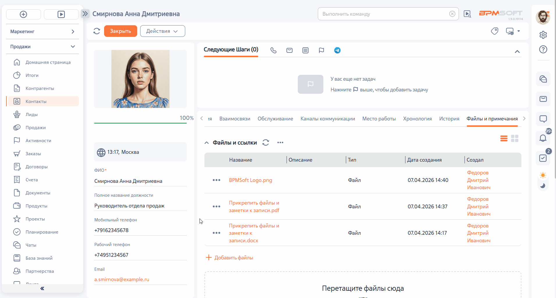 Вы можете прикрепить файл или оставить примечание к записи раздела в BPMSoft. Для этого перейдите на вкладку «Файлы и примечания». На вкладке находятся деталь «Файлы и ссылки» и группа полей «Примечания».